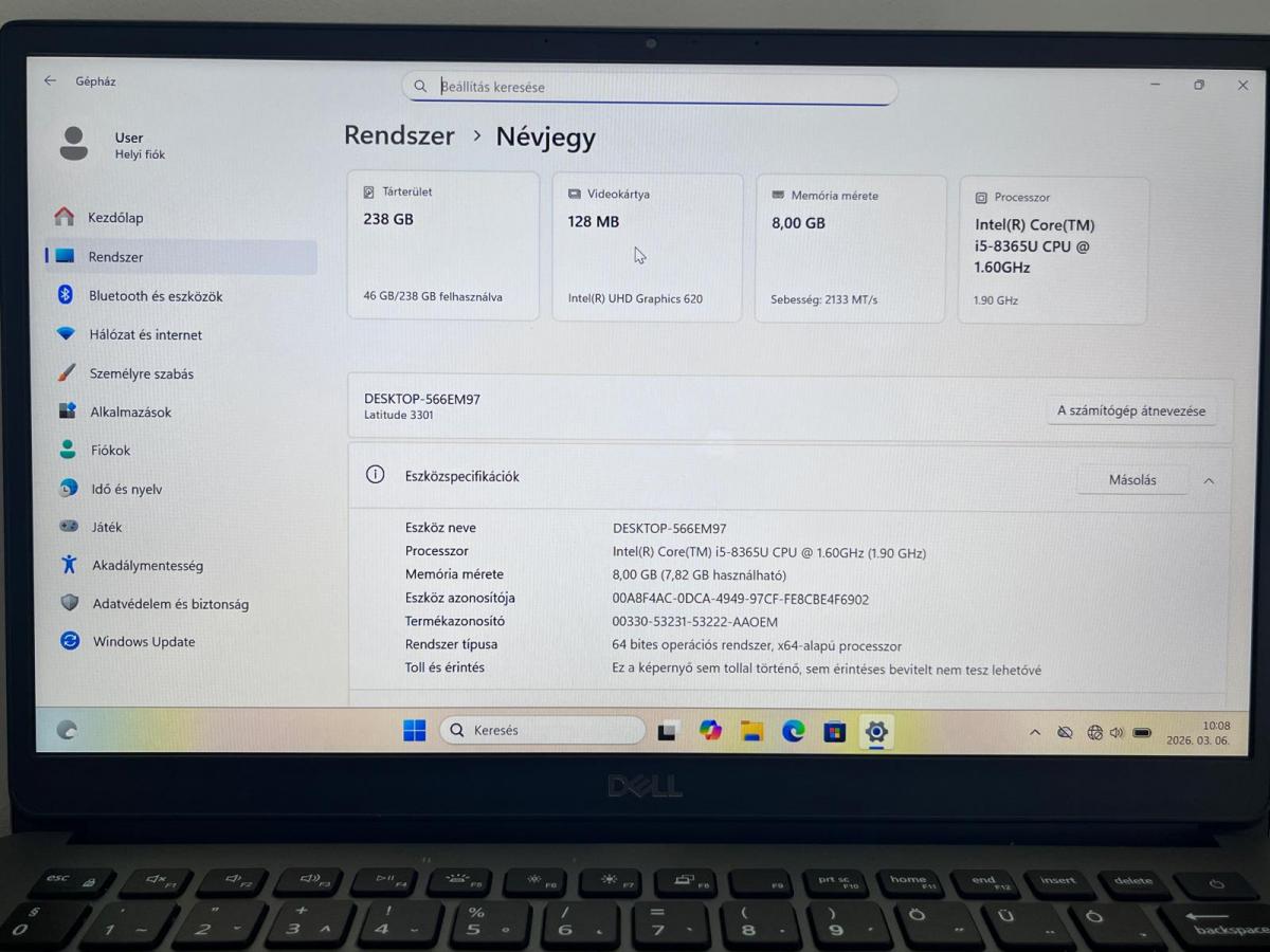 | Processzor típus | Core i5, 8th gen |