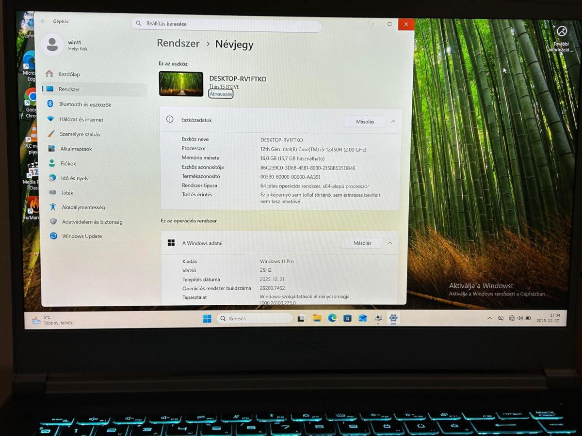 SSD meghajtókÁllapot A kategória Alaplapi chipkészlet Intel Processzor típus Core i5, 13th gen Processzor órajel 2.4 GHz Processzor paraméterei Intel® Core™ i5-13450HX Processor 20M Cache, up to 4.60 GHz RAM típusa DDR5-SO-Dimm RAM mérete 16 GB Merevlemez típusa SSD (M.2, NVME) Merevlemez mérete 512 GB Másodlagos merevlemez típusa Nincs Másodlagos merevlemez mérete 0 GB Optikai meghajtó Nincs Video vezérlő Nvidia RTX4050 6GB GDDR6 Kijelző mérete 15.6 inch Kijelző méretarány 16:9 Kijelző felbontása 1920*1080 Kijelző tulajdonságok IPS Panel, 144Hz Hangkártya HD Audio Memória kártya olvasó Nincs USB port típusa 3db USB 3.2 + 1db USB 3.2 Type-C USB portok száma 4 db Vezeték nélküli hálózati vezérlő Bluetooth, Wi-Fi 6 (ax) Vezetékes hálózati kártya Gigabit Webkamera Van Akkumulátor állapota Újszerű Egyéb portok HDMI, Type-C Billentyűzet háttérvilágítás Van Laptop jellege Gamer Megjegyzések 2026 februárig garanciális. Gyári állapot. Gyári doboz. Serial:MP2MSQ4M Állapot megjegyzések Újszerű állapot